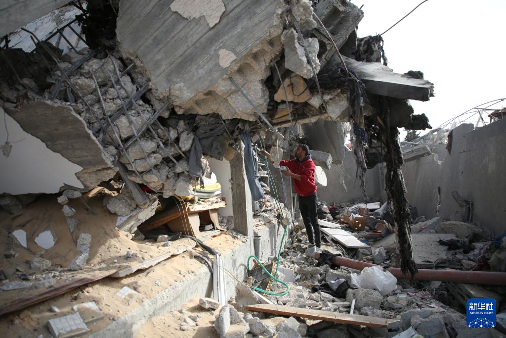 3月26日,在加沙地带南部城市拉法,一名男子查看以军空袭后的废墟。新华社发(哈立德·奥马尔摄)pagebreak
