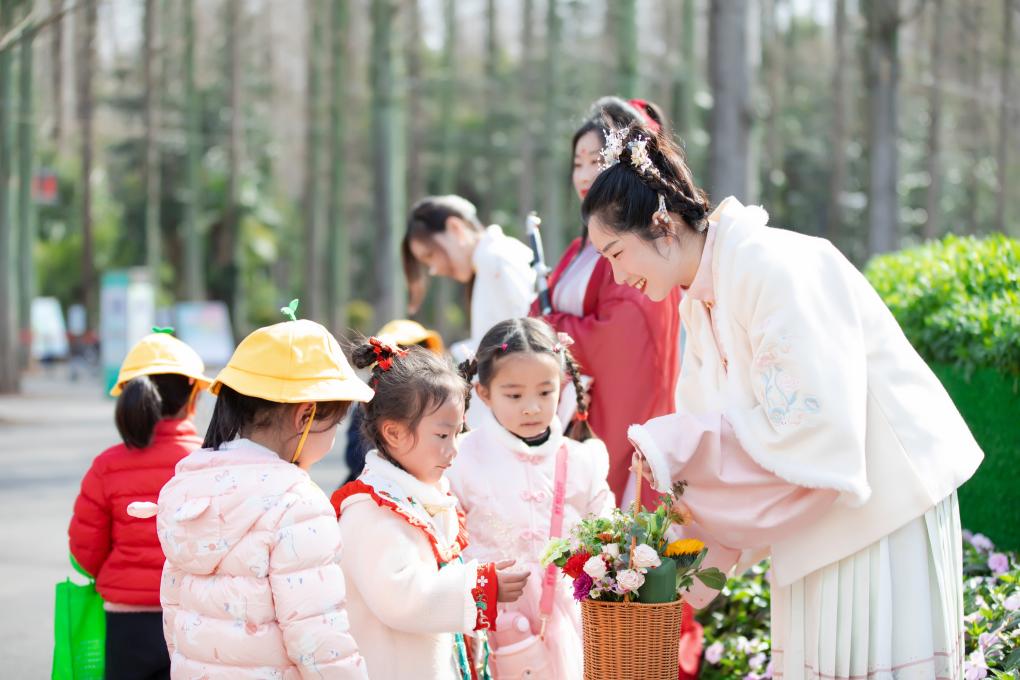 2024年上海崇明花朝节期间,工作人员身着传统服饰扮演的“花神”与小游客互动。(受访者供图)