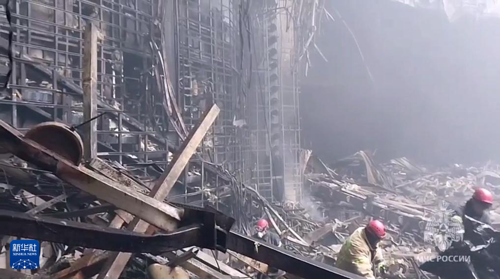 这张俄罗斯紧急情况部3月23日发布的视频截图显示,救援人员在现场工作。新华社发