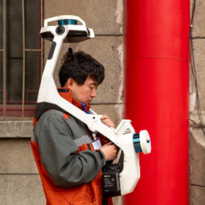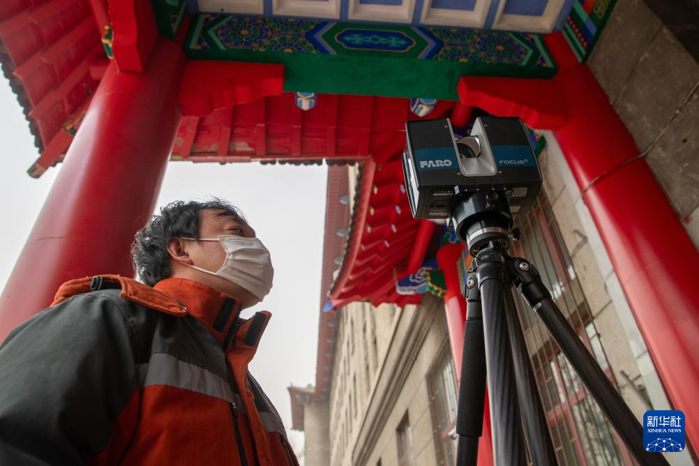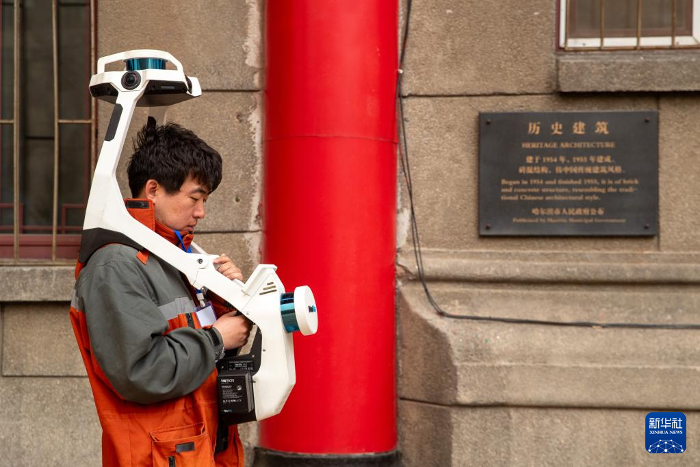 2024年3月28日,在哈尔滨工程大学,哈尔滨市勘察测绘研究院的测量员在进行历史建筑扫描工作。新华社记者 张涛 摄