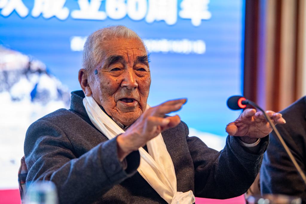 2020年10月1日,87岁高龄的老登山家贡布在庆祝中国西藏登山队成立60周年活动上致辞。新华社记者 孙非 摄