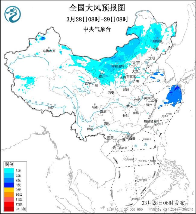 中央气象台3月28日06时继续发布大风蓝色预警: