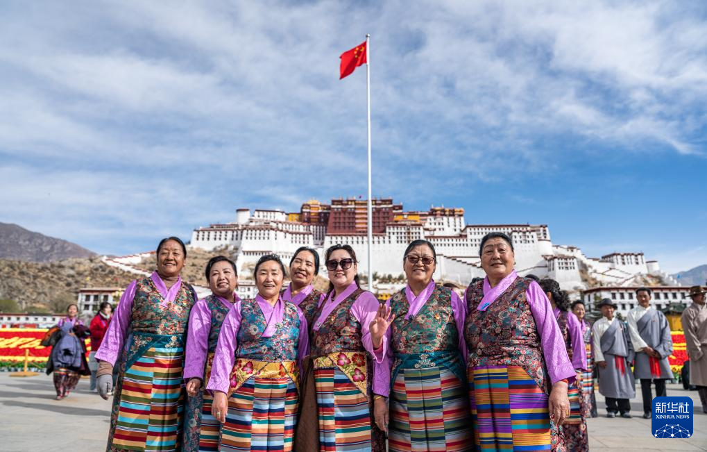 3月28日,人们在布达拉宫广场参加升旗仪式后合影留念。新华社记者 丁增尼达 摄pagebreak