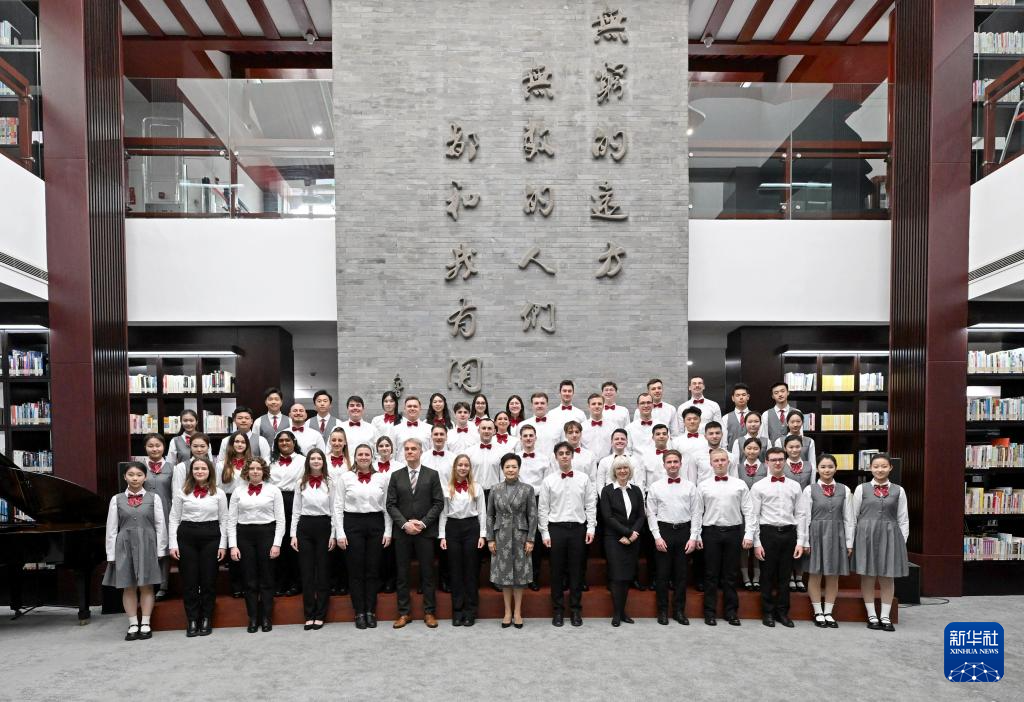 3月28日下午,国家主席习近平夫人彭丽媛在北京市第三十五中学会见来华参访的德国伯乐中文合唱团师生代表。这是彭丽媛来到学校书院,受到师生们热情欢迎。新华社记者 谢环驰 摄