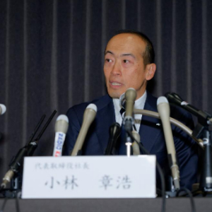 3月29日,在日本大阪,小林制药公司社长小林章浩出席新闻发布会。新华社记者 张笑宇 摄
