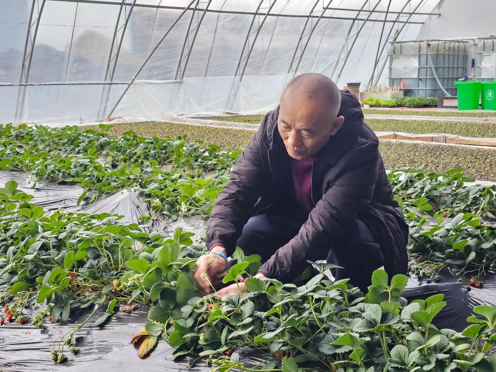 九三村村民李义承包的草莓温室大棚内,秧苗上的草莓娇艳欲滴。刚刚送走一批采摘的客人,他正查看土壤湿度,决定是否打开滴灌系统。“棚室日间不能高于30摄氏度,夜间不能低于8摄氏度,还要注意不能缺水。”