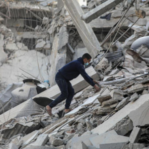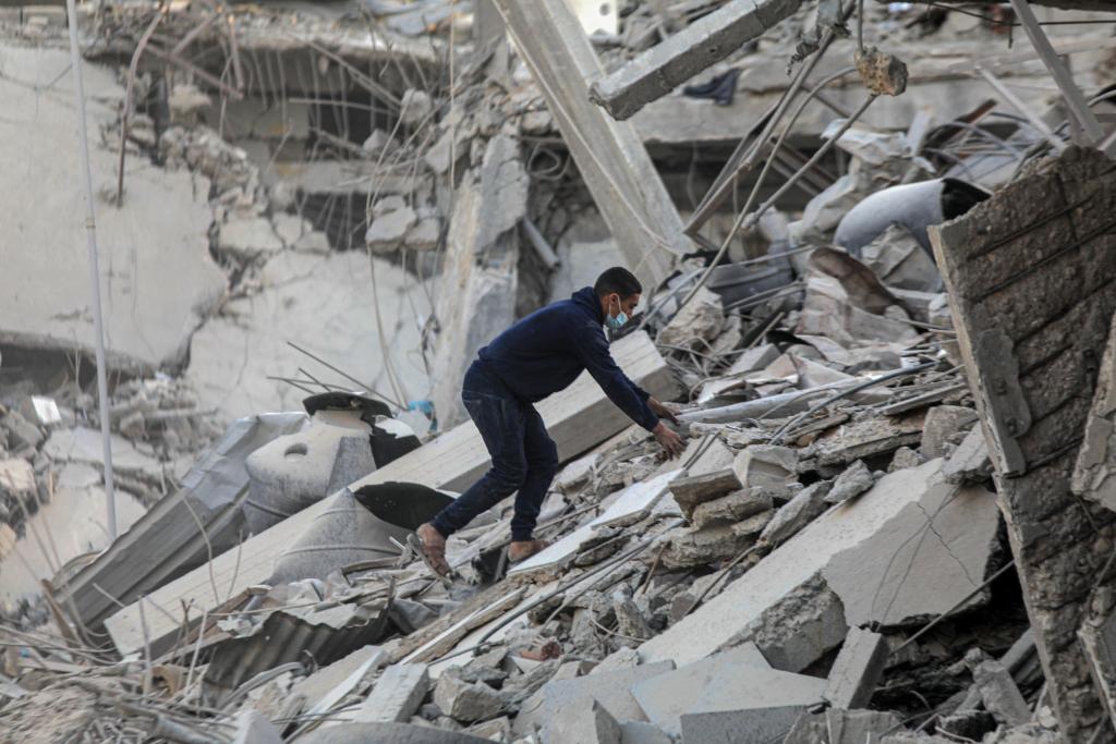 3月6日,在加沙地带南部城市汗尤尼斯,一名男子清理建筑废墟。新华社发(里泽克·阿卜杜勒贾瓦德摄)