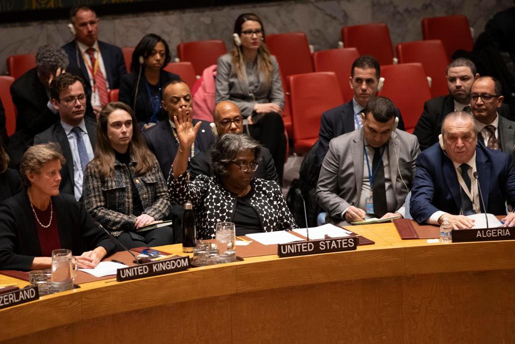2月20日,美国常驻联合国代表琳达·托马斯-格林菲尔德(前中)在联合国安理会就加沙地带立即实现人道停火的决议草案进行表决时投反对票。因美国否决,这份由阿尔及利亚代表阿拉伯国家提出的决议草案未获通过。新华社记者谢锷摄