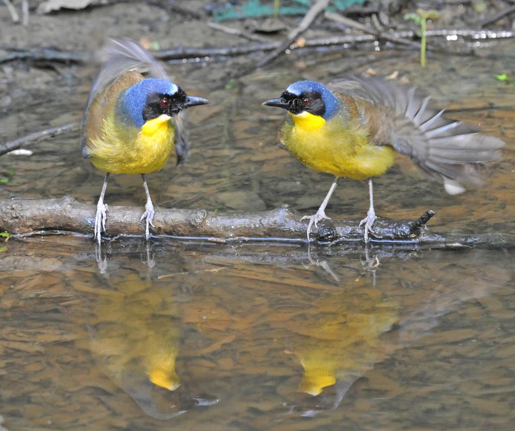 这是2017年4月22日在江西省婺源县秋口镇王村月亮湾湿地拍摄的两只蓝冠噪鹛。新华社发(张卫国摄)