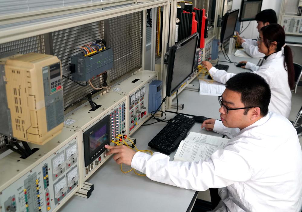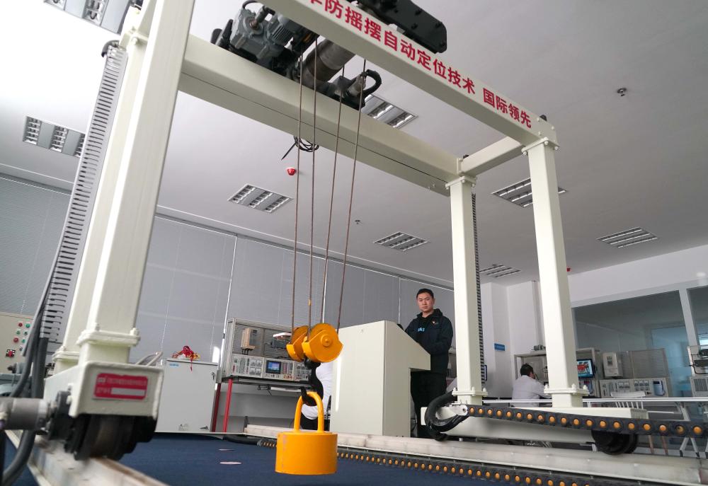 技术人员在卫华集团的电气实验室内做起重机电气防摇摆调试(3月14日摄)。