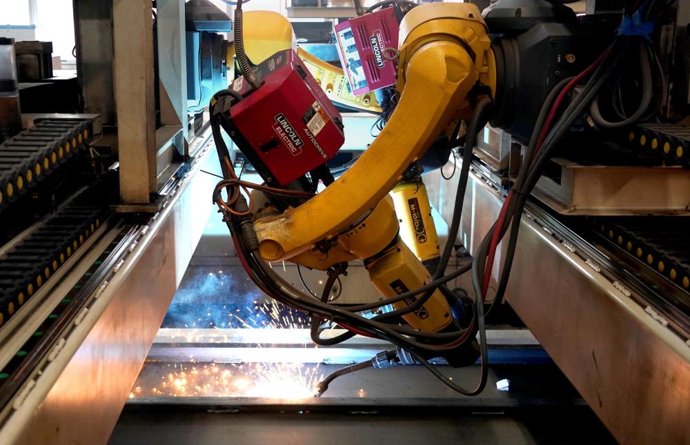 在卫华集团的智能轻型车间内,主梁焊接机器人在进行起重机主梁腹板与水平角钢焊接作业(3月14日摄)。