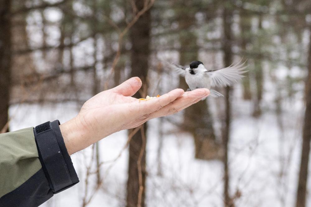 2024年3月15日,在伊春市大箐山县朗乡镇,李臣在东山公园给鸟喂食。李臣是伊春森工朗乡林业局有限责任公司的护林员,清晨上山唤鸟是他的一大乐事,已坚持超过10年,当地人称他“鸟叔”。爱动物的李臣带动不少居民加入到关爱鸟类的行动中来。