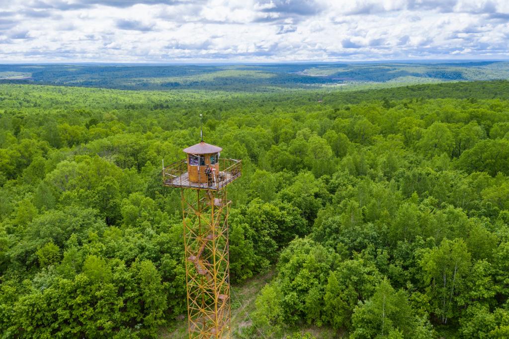2021年6月4日,伊春市乌伊岭林业局有限公司阿廷河林场分公司的护林员刘宏伟在防火瞭望塔瞭望。