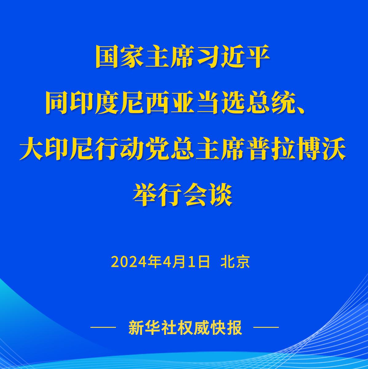 4月1日下午,国家主席习近平在人民大会堂同印度尼西亚当选总统、大印尼行动党总主席普拉博沃举行会谈。