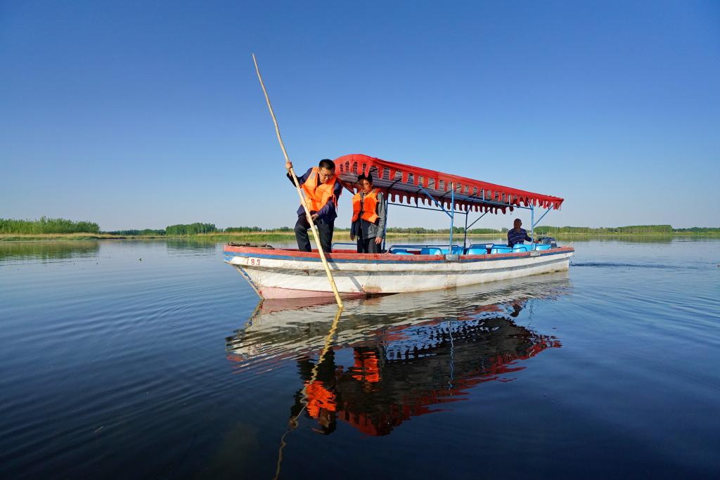 鲁昊(左)在白洋淀进行调研(2019年4月30日摄)。