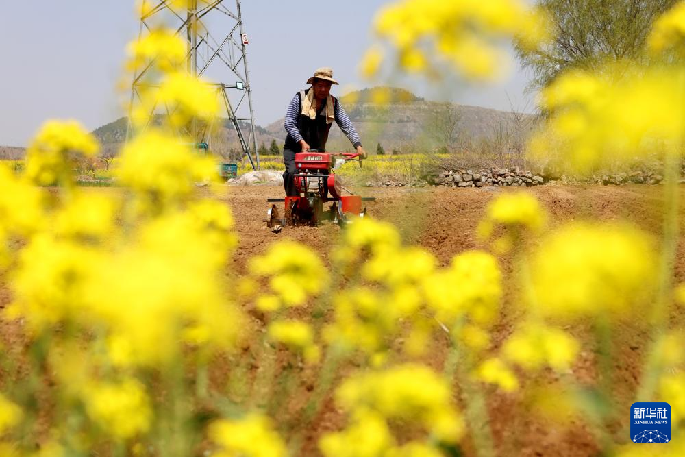 3月31日,山东省枣庄市齐村镇乔屯村农民在油菜花田间耕作。