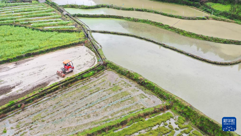 3月31日,湖南省永州市双牌县麻江镇麻江村村民驾驶农机在翻耕农田(无人机照片)。