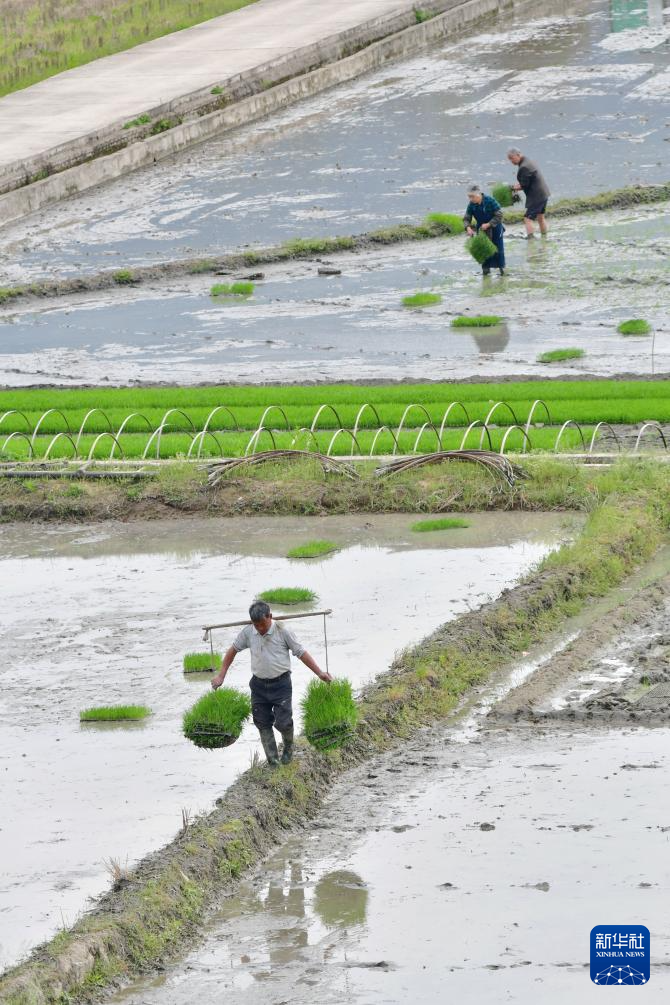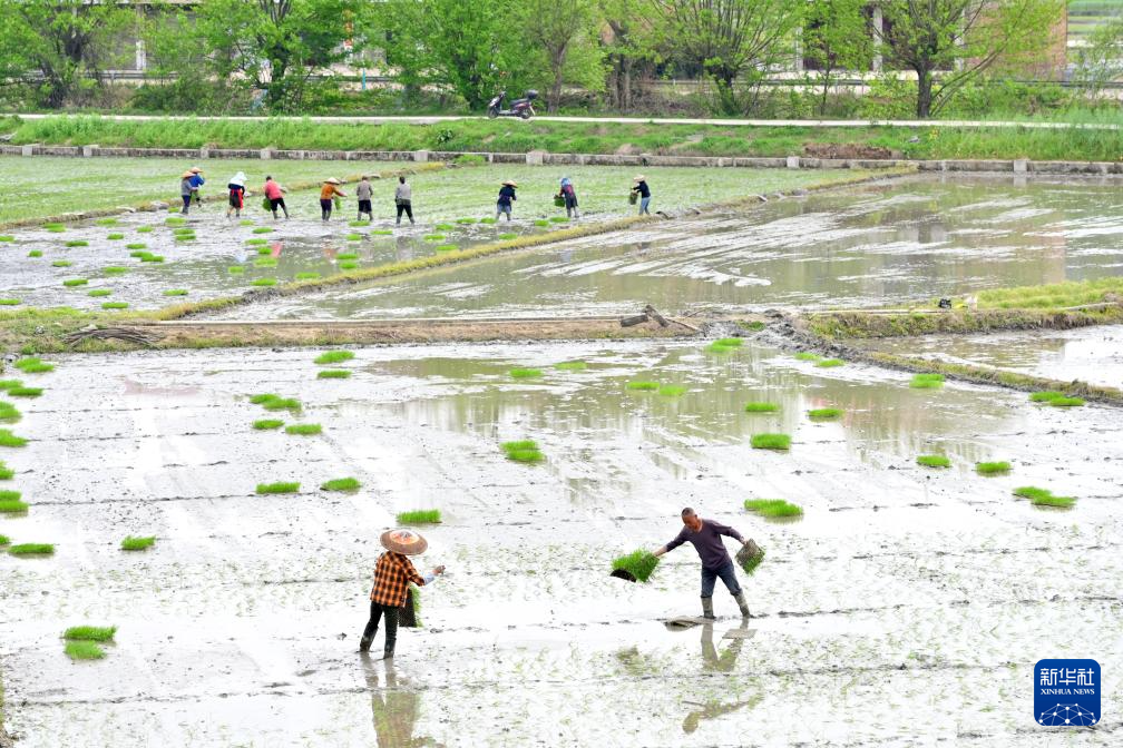 3月31日,在湖南省娄底市双峰县井字镇花桥村,农民在田间抛秧。
