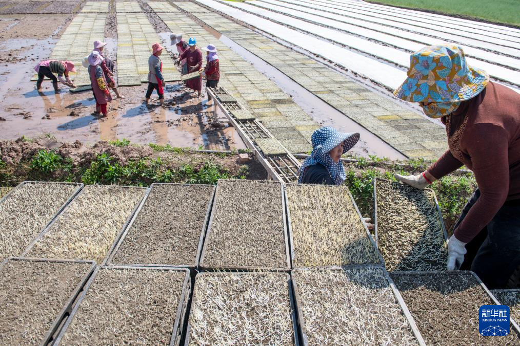 3月31日,在四川省阆中市水观镇金鼎观村,村民在田间安放秧盘。