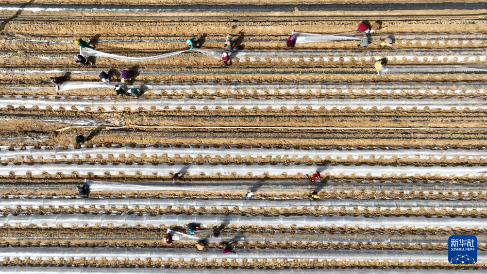 3月31日,河北省唐山市丰南区钱营镇中石各庄村农民为刚刚种植的红薯覆膜(无人机照片)。