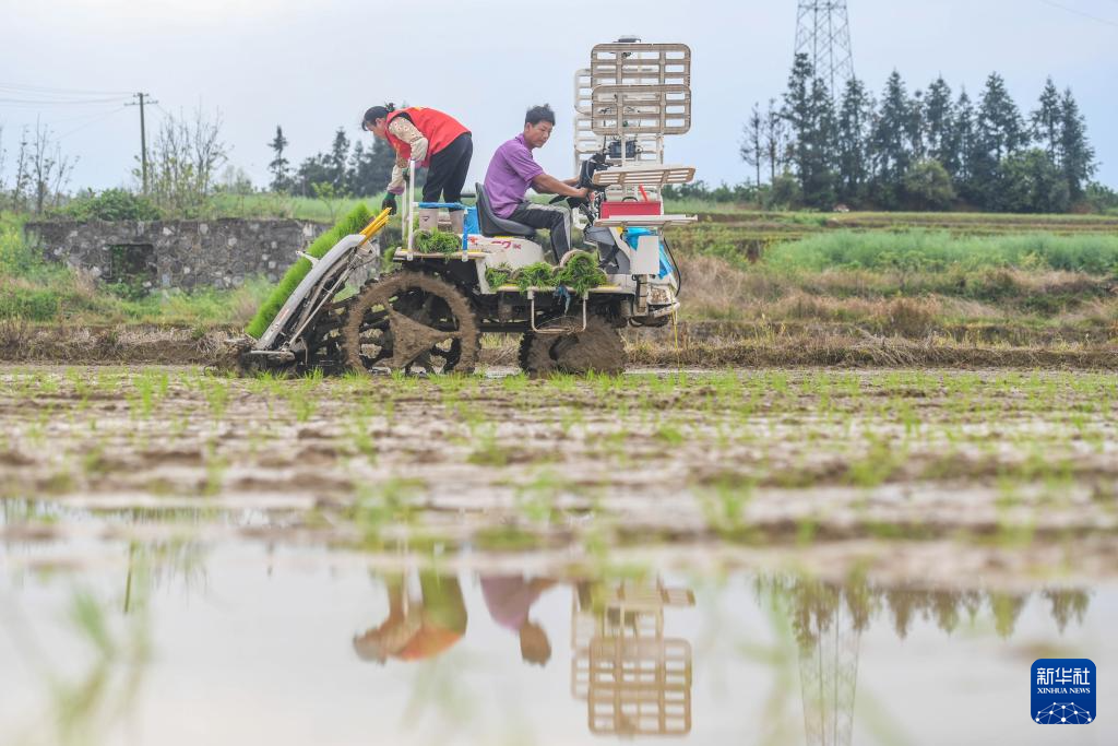 3月31日,在湖南省永州市道县蚣坝镇合兴村,和丰农机专业合作社员工驾驶机械开展早稻插秧作业。