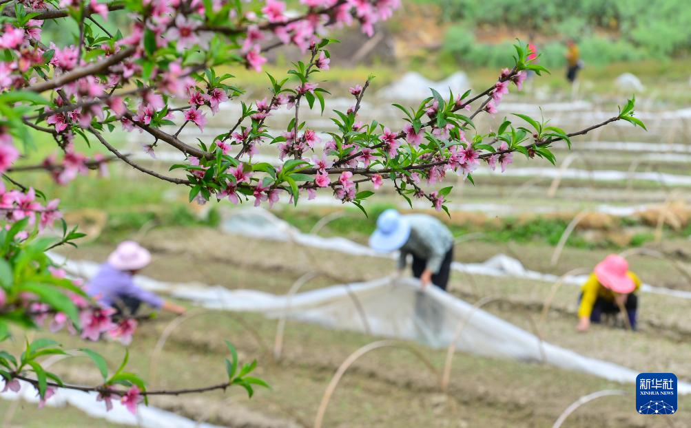 3月31日,村民在贵州省黔东南苗族侗族自治州从江县贯洞镇宰门村田间管护辣椒秧苗。