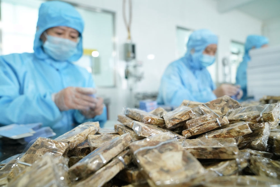 ↑2022年8月24日,在黑龙江省大兴安岭地区加格达奇区一家山野珍品科技开发企业,工人对林下绿色有机食品进行加工作业。近年来,黑龙江省大兴安岭地区优化稳定产业链,因地制宜发展林果、林菌等林下绿色有机食品种植业,打造林下绿色有机食品精深加工基地。
