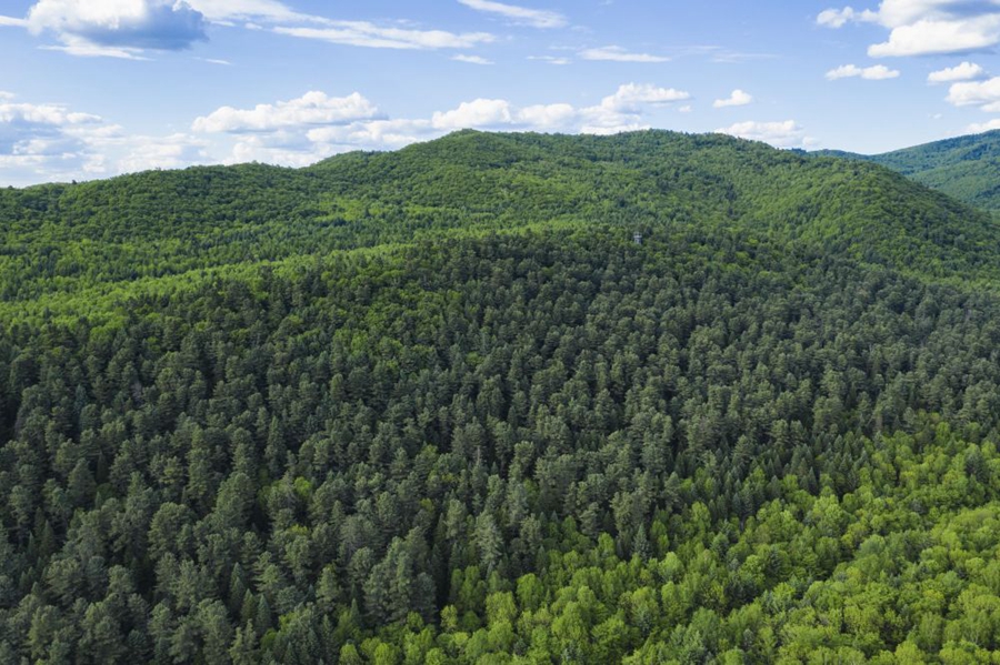 ↑2021年6月4日,在伊春森工乌伊岭林业局有限责任公司阿廷河林场分公司施业区,护林员驾车进行森林巡护(无人机照片)。