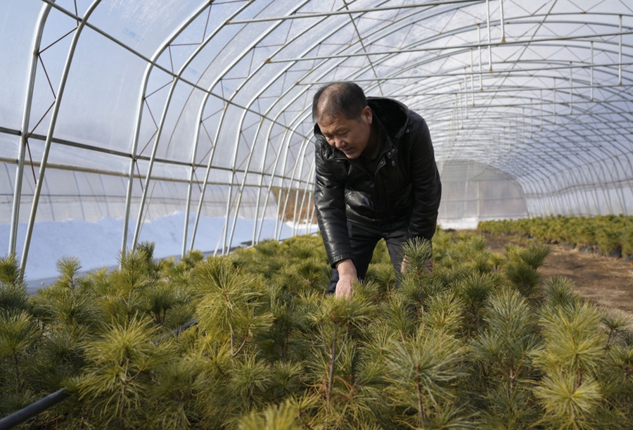 ↑2024年3月12日,在龙江森工集团苇河林业局有限公司平林苗圃,苗圃主任闫朝福在检查大棚中的苗木。作为一名高级工程师,闫朝福有30余年造林绿化苗木培育和林木良种繁育工作经验,他希望能为实现“青山常在、永续利用”做出自己的贡献。