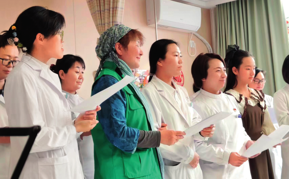 北京市海淀医院安宁病房举办春节联欢会,图为徐舒(左二)和安宁团队其他成员为患者唱歌(2024年2月4日摄)受访者供图
