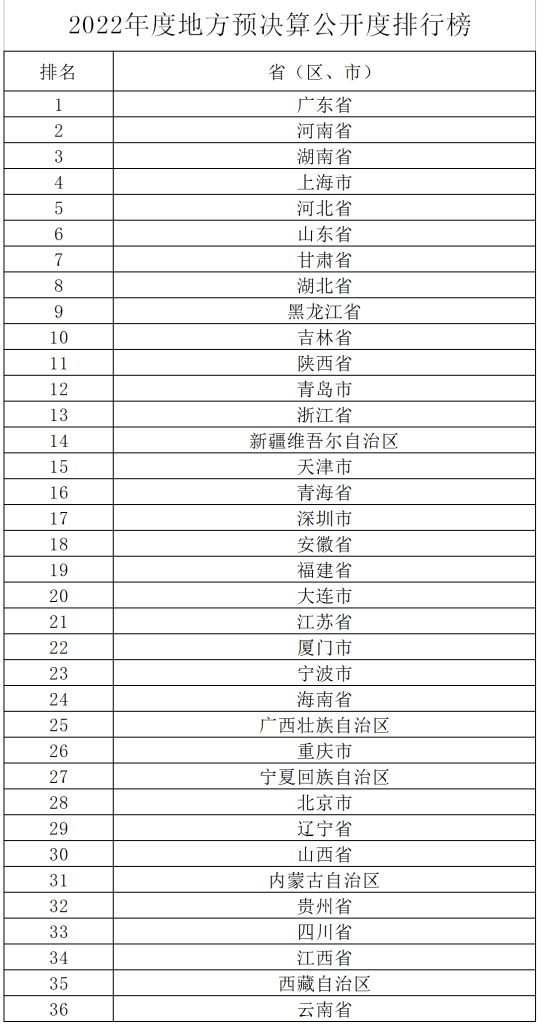 新华社北京4月2日电(记者申铖)财政部2日对外发布“2022年度地方预决算公开度排行榜”,广东、河南、湖南位居榜单前三名。这是2015年以来,财政部第7次在全国范围内开展地方预决算公开检查。