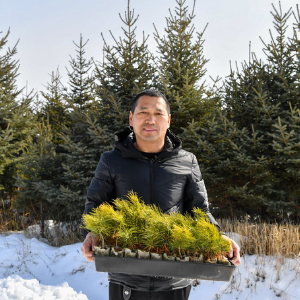 三月下旬的大兴安岭,冬雪未消,温室大棚不远处,几处露天的棚子里,存放着今春的“新芽”。“这是育好的苗,等到天再暖和些就能上山了。”纪东亮抚去地面顶层的积雪,又掀开厚实的棉被,一株株培育在轻基质杯中的树苗鲜嫩翠绿。“为了让小树苗能温暖过冬,落雪前我们就把被子盖上了。”
