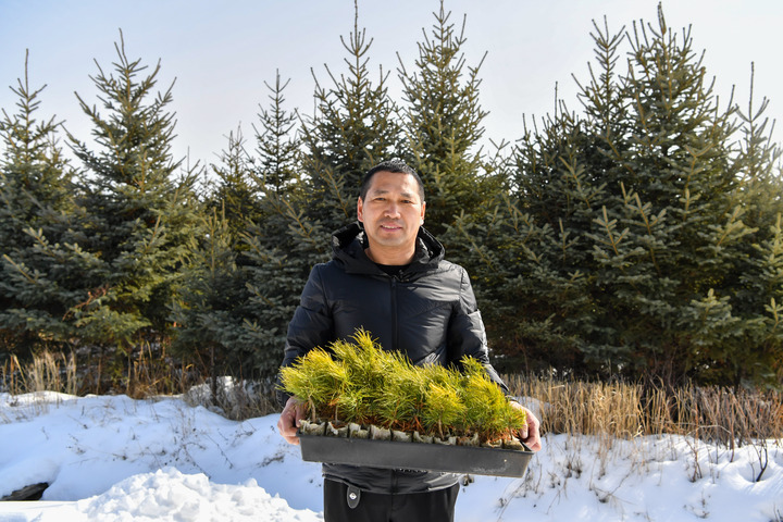 3月16日,纪东亮在展示培育的西伯利亚红松苗。新华社记者 陈益宸 摄