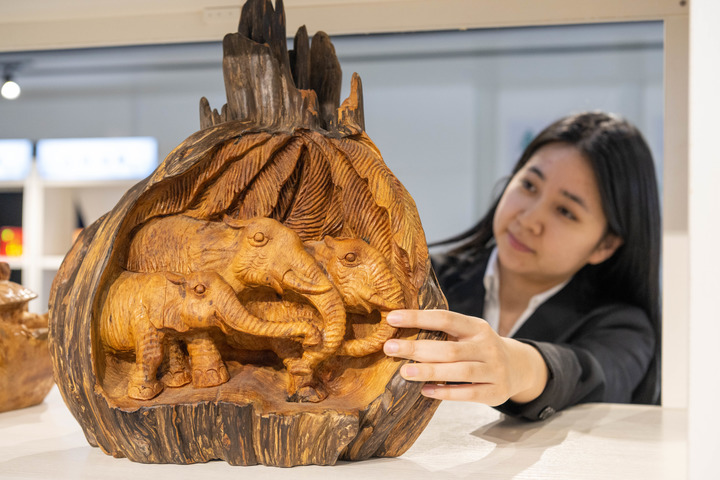 在伊春森工电子商务产业园,工作人员摆放木雕摆件(3月12日摄)。除署名外组图均由新华每日电讯记者 谢剑飞 摄