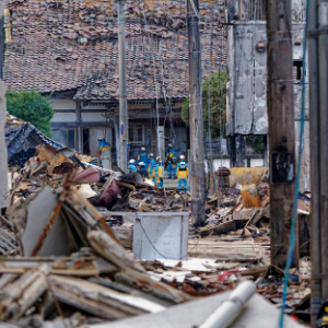 2024年1月4日,警察在日本石川县轮岛市“轮岛早市”废墟中作业。新华社记者张笑宇摄