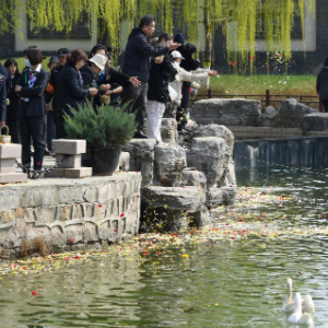 4月2日,在北京长青生命纪念园,骨灰撒海的逝者家属向湖中抛撒花瓣追思祭奠。新华社记者 鞠焕宗 摄