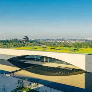 蓝天白云下,水平延展的屋顶,犹如平摊开的书页。启动区这座颇具中国风的图书馆外立面上,一片片竖向梭形百叶,以简牍为意象,而且是可调节的遮阳装置,可随着阳光转动,自动调节室内光线。