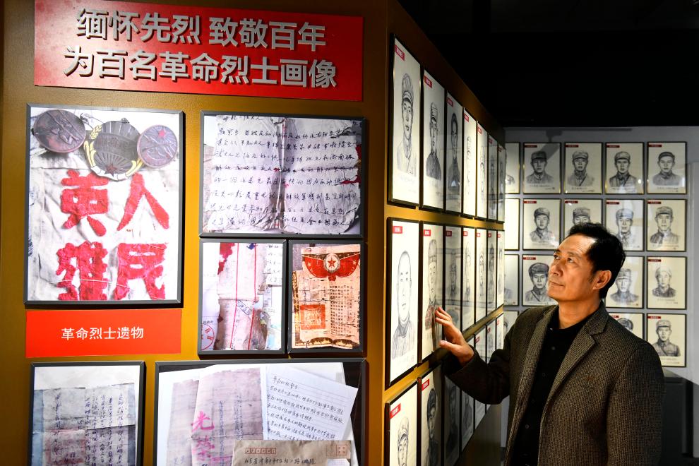 2023年3月28日,林宇辉在烈士画像前。新华社记者郭绪雷 摄