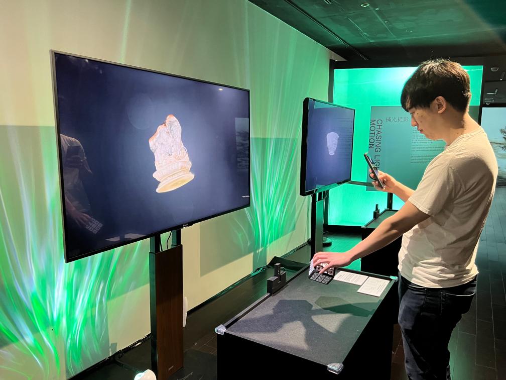 你想象过将翠玉白菜、肉形石拿在手里细细观赏吗?在“捕光捉影”单元,借助一个小小的立方体感测器即可实现。通过数字装置,观众手中的立方体化身眼前屏幕中的3D文物模型,随着手腕转动,文物360度的样貌也一一呈现。