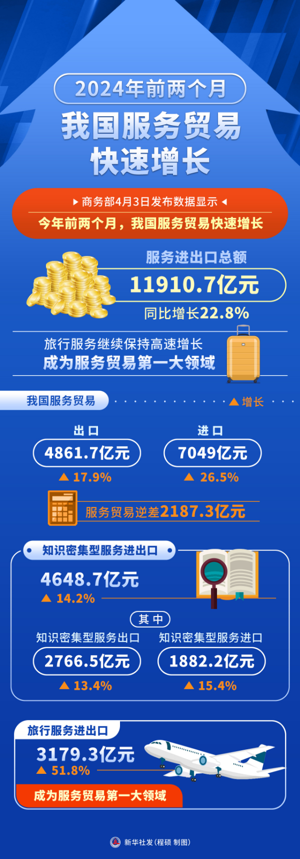 数据显示,2024年1至2月,我国服务贸易出口4861.7亿元,增长17.9%,进口7049亿元,增长26.5%;服务贸易逆差2187.3亿元。主要呈现以下特点: