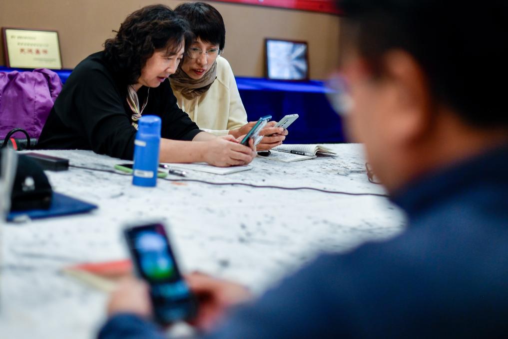 吉林省社区老年大学学员讨论如何进行视频剪辑(2023年10月30日摄)。新华社记者 许畅 摄
