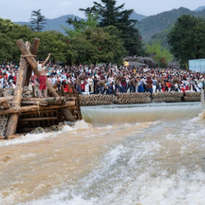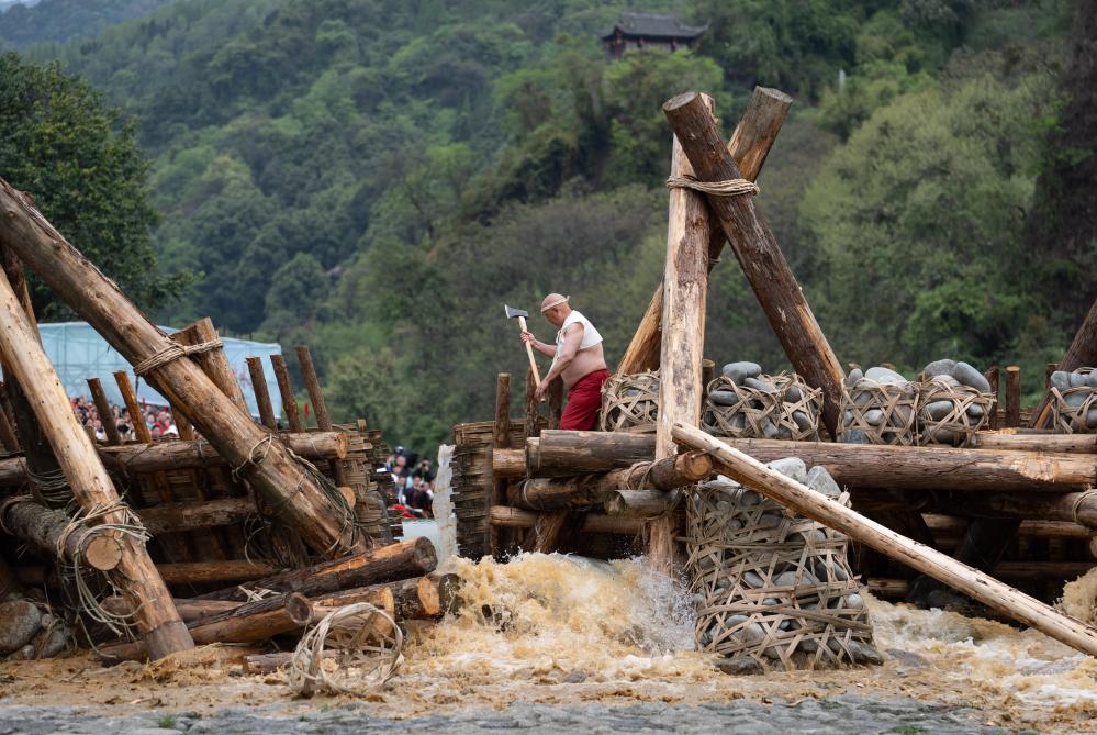 “砍杩槎,放水啰!”河心中的一群青壮年堰工高声喊出口号,举起利斧,奋力砍断岁修时筑起的杩槎上的竹索,数十名堰工齐力拉动绳索放倒杩槎,瞬时岷江水奔流而下。