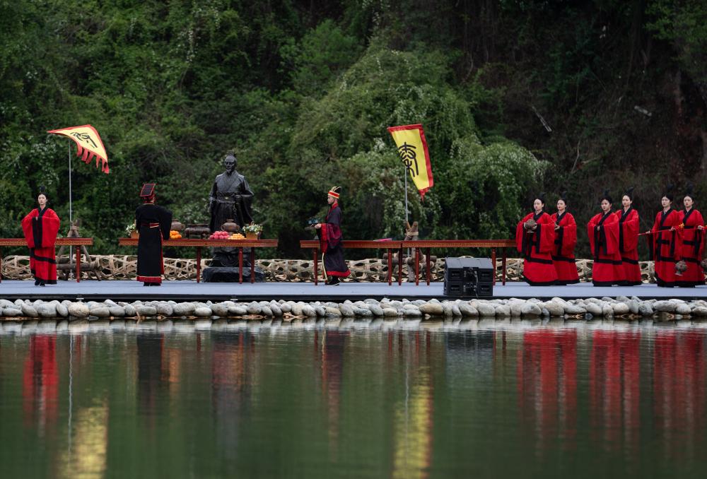 新华社成都4月5日电(记者李力可、袁秋岳)4日上午,2024都江堰放水节“放水大典”启幕,上千名中外嘉宾身着秦朝服饰,学习秦朝礼仪,沉浸式体验治水文化。