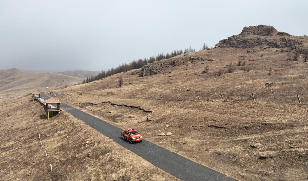 4月4日,内蒙古自治区大青山国家级自然保护区管理局古路板管理站古路板防火西小队队长杨军利在保护区内进行防火巡护(无人机照片)。新华社记者 贝赫 摄