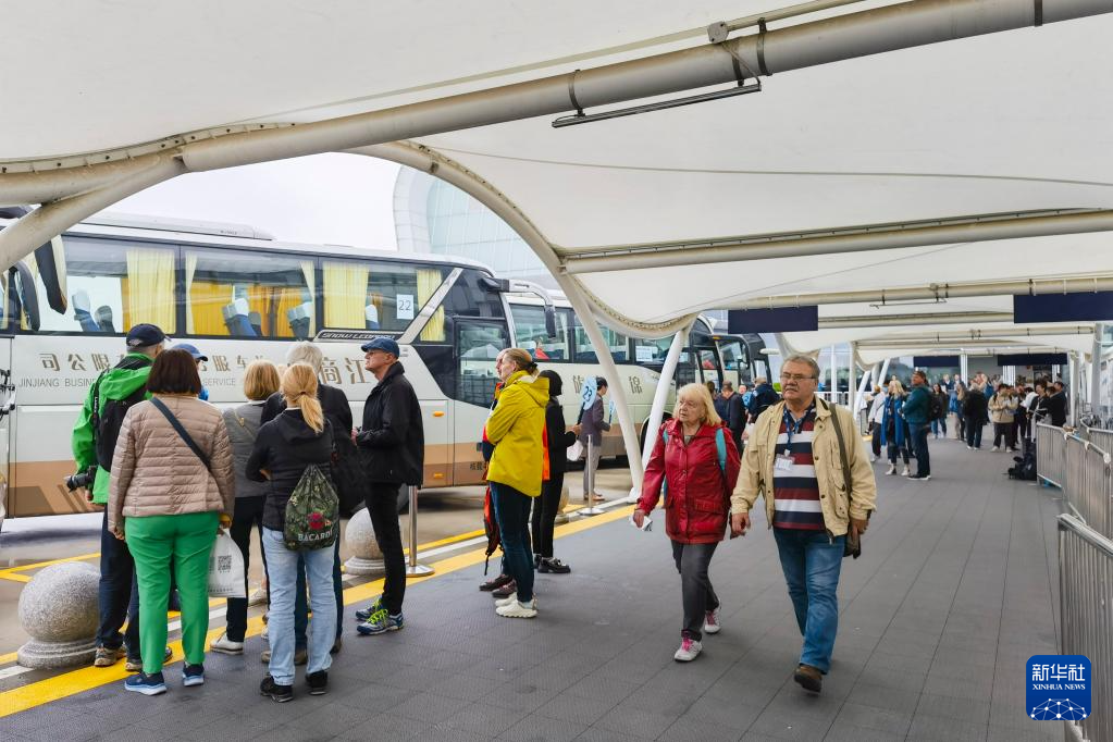 4月6日,入境游客抵达上海吴淞口国际邮轮港后,乘坐巴士前往上海多个景区游览。新华社记者 陈爱平 摄