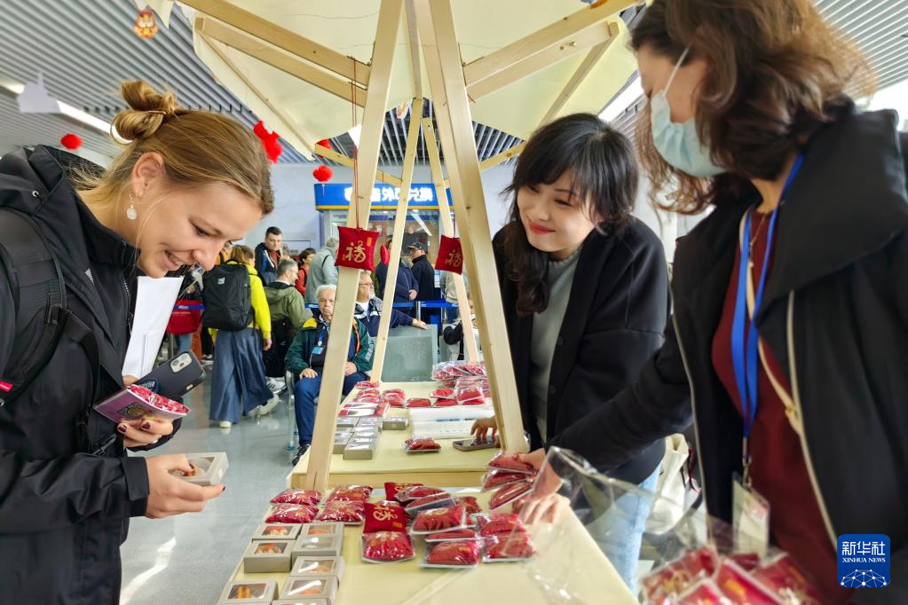 4月6日,入境游客在上海吴淞口国际邮轮港到达大厅设立的摊位前驻足,了解文创产品。新华社记者 陈爱平 摄