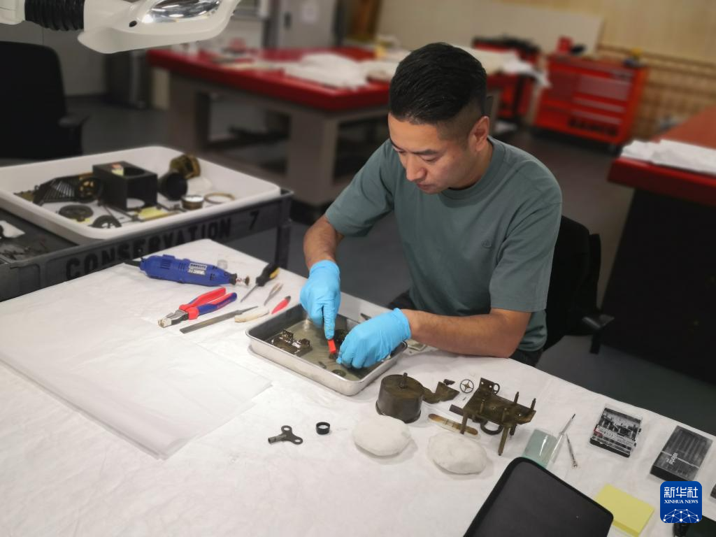 “这个古钟表整体保存还是挺好的,但我们发现它在此前修复中装反了表盘,还有火车的一些轮子生锈脱落了,表芯也无法运行。”梁嘉放介绍说。