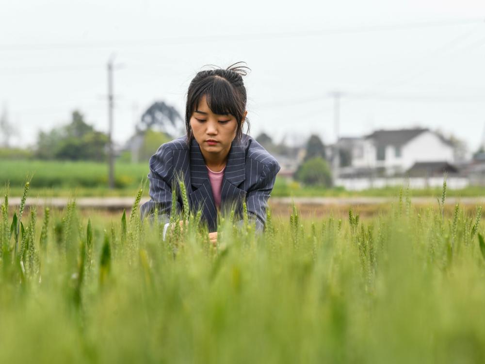 在四川省成都市崇州市隆兴镇,王伶俐在田间查看冬小麦的长势情况。新华社记者 王曦 摄