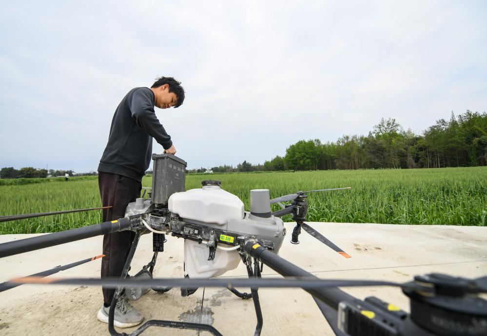 3月26日,在四川省成都市崇州市隆兴镇,王李锐在操作无人机进行冬小麦田间病虫害防治。25岁的王李锐是四川省成都市崇州市杨柳土地股份合作社的一名农机手。凭借爱钻研的劲儿,王李锐熟练掌握了驾驶各种现代化农机设备及无人机植保等技能。曾经在外打工的他2022年主动选择回到村里全职从事农业生产,成为了一名“农机潮人”。