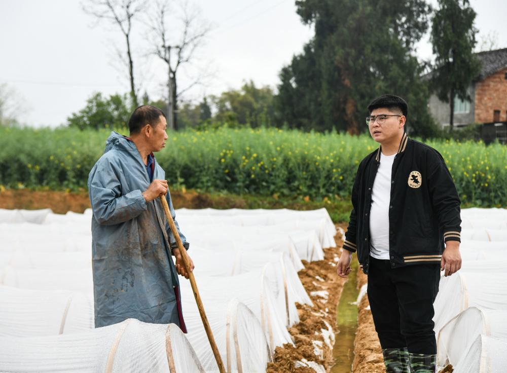 4月2日,在四川省达州市通川区北山镇,雷超(右)在和农户交流水稻育秧情况。